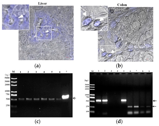 Colonization of E. hellem. (a) Liver and (b) colon samples were collected from E. hellem infected mice, immediately frozen by liquid nitrogen, and then prepared by frozen sectioning. The existences of E. hellem were detected by calcofluor white (CFW) staining, as shown in blue color (also pointed out by white arrow heads) (scale bar = 2 μm). (c) Dendritic cells (DCs) isolated from E. hellem infected mice spleen, the cDNAs were then prepared. A representative image of PCR results using six individual DCs-cDNA samples as template (Lane 1–6), and E. hellem total DNA as positive template control (Lane 7) is shown. All samples showed positive results (as pointed out by arrow), indicating the existence of E. hellem in host DCs. (d) Lane 1 and 2 are representative two DCs-cDNA samples from E. hellem infected mice as template with E. hellem specific primers (arrow shows the positive band at 547 bp); Lane 3 and 4 are representative two DCs-cDNA samples from un-infected mice as template with E. hellem specific primers; Lane 5 is E. hellem total DNA as positive template control (arrow shows the positive band at 547 bp); Lane 6 and 7 are the same two DCs-cDNA samples as in Lane 1 and 2 respectively, and are used as templates with actin specific primers (arrow shows the positive band at 250 bp); Lane 8 and 9 are the same two DCs-cDNA samples from lane 3 and 4 respectively, and are used as templates with actin specific primers (arrow shows the positive band at 250 bp).