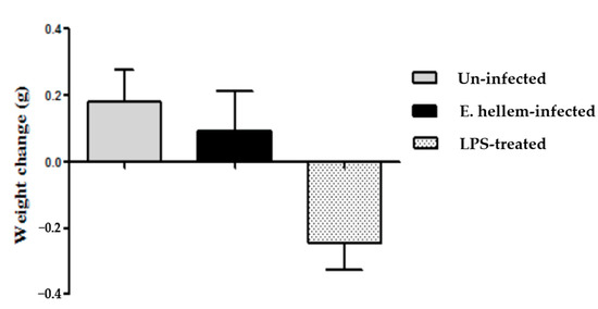 The body weights of all three groups of mice were monitored. Compared to the LPS-treated mice, the uninfected control and E. hellem infected mice did not lose any weight (Figure 2).