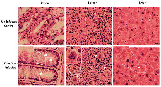 Histopathological analysis. Uninfected control and E. hellem-infected mice organs (colon, spleen and liver) were collected and frozen sectioned respectively. All sections were then subjected to hematoxylin and eosin staining. Here are the representative images of few E. hellem-infected organ samples with histopathological changes. In colon, enlarged microvilli were observed (white arrow heads); In spleen and liver, lymphoepithelioid granulomas were seen (white arrow heads). Images are representatives of all samples from eight control and infected mice respectively. (scale bar = 10 μm).