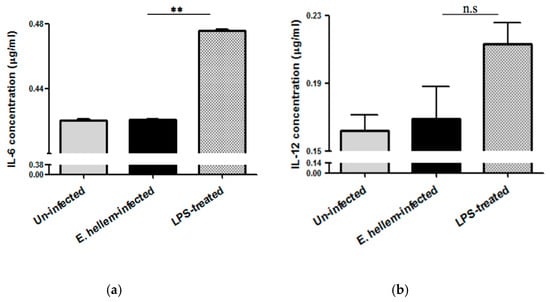 Peripheral blood samples were collected from mice of all three groups, the uninfected control, E. hellem-infected and LPS-treated. Sodium citrate was used as anticoagulant, and blood samples were centrifuged at 1000× g for 10 min to enrich plasma. All plasma samples were then subjected to cytokine expression assay, using mouse Interleukin 12 ELISA kit and Mouse IL-6 ELISA Kit (ThermoFisher Scientific, Waltham, MA, USA).
