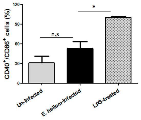 Flow cytometry analysis of DCs maturation. DCs isolated from uninfected control mice, E. hellem-infected mice and LPS-treated mice were subjected to flow cytometry analysis. The amounts of CD40+/CD86+ double positive DCs were recorded, and the ratios of uninfected to LPS-treated group and E. hellem-infected to LPS-treated group were calculated and presented in figure. As shown, DCs from either E. hellem-infected or uninfected group have significant lower numbers of matured cells. (* = p < 0.05, n = 8 for each group in one experiment, and the experiments have repeated for three times).