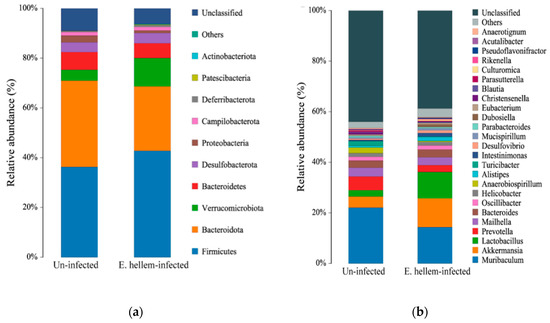 Composition of the gut bacteria in E. hellem-infected and uninfected group. The relative abundance of phylum-level (a) and genus-level (b) gut bacteria taxa were analyzed and showed in figure. The results showed E. hellem infection greatly changed the microbiota composition, both on phylum and genus levels.