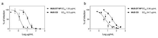 Importantly, the results on SARS-CoV-2 with MUS:OT NP and MUS CD were confirmed in two independent labs with two different strains of SARS-CoV-2 (SARS-CoV-2/München-1.1/2020/929 and SARS-CoV2/Switzerland/GE9586/2020). In both cases, MUS:OT NP showed higher potency than MUS CD (Figure 1 and Figure S3).