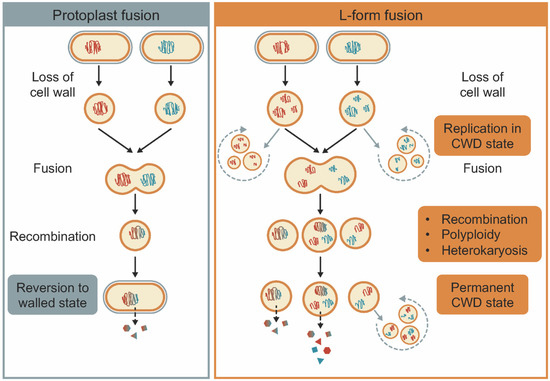 The general process of protoplast fusion compared with L-form fusion. Both methods share some steps like the loss of cell wall and cell–cell fusion but differ in other key steps. Fusion in L-forms can lead to multiple possibilities due to polyploidy in daughter cells, whereas reversion to a walled state is essential in protoplast fusion. Differences in chromosome size are for depiction purposes only and not to scale.