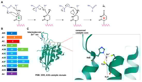 Humans and non-human primates have 11 members of the APOBEC gene family, namely APOBEC1 (A1), APOBEC2 (A2), APOBEC3A (A3A), APOBEC3B (A3B), APOBEC3C (A3C), APOBEC3D (A3D), APOBEC3F (A3F), APOBEC3G (A3G), APOBEC3H (A3H), APOBEC4 (A4) and activation-induced cytidine deaminase (AICDA). Other animal species have fewer APOBEC genes [,]. All species from fish to mammals encode the primordial APOBEC member, activation-induced cytidine deaminase (AID), but A2 also is an ancestral APOBEC gene []. The A1 gene likely evolved by duplication of the AICDA gene and is tightly linked on the same chromosome []. The APOBEC proteins (A1, A3, and AID) have deamination activity on cytosines within polynucleotides []. A4 appears to lack deaminase activity [], whereas the enzymatic activity of A2 is controversial []. Active APOBECs induce deamination of cytosine to uracil within RNA or DNA targets by a zinc-dependent hydrolytic mechanism using a glutamic acid within the conserved HXE motif [,]. A zinc-stabilized hydroxide ion (-OH) group from water attacks the NH2 at the 4-position of the cytosine aromatic ring to form uracil with the release of NH3 (Figure 1A) [,,,,]. This basic mechanism is preserved from bacterial cytosine deaminases to mammalian enzymes [].