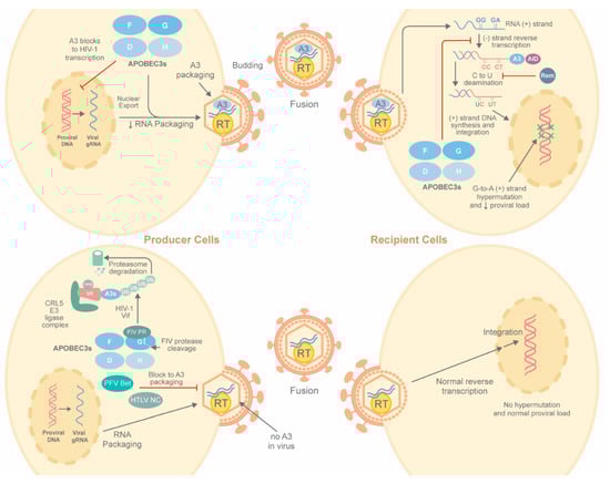 Deamination-dependent restriction of viruses by APOBECs. In the absence of an antagonist, such as HIV-1 Vif, virus-producing cells (top left) often package A3 proteins, including A3D, A3F, A3G and A3H, (abbreviated as D, F, G, and H) into virions together with reverse transcriptase and two copies of genomic RNA. A3 enzymes (specifically A3G) also may block HIV-1 transcription, lowering the amount of viral RNA available for packaging. Subsequent infection of susceptible recipient cells (upper right) leads to reverse transcription of viral plus-strand RNA. During minus-strand DNA synthesis, C-to-U deamination occurs, leading to G-to-A hypermutation on the viral DNA plus strands. Blocks to reverse transcription also occur, resulting in integrated viral DNA with increased G-to-A transition mutations and reduced proviral loads. Virus-producing cells (lower left) that make an antagonist, such as Prototype Foamy Virus (PFV) Bet or Human T-Cell Leukemia Virus type 1 (HTLV-1) nucleocapsid (NC), fail to package A3. Other A3 antagonists, such as HIV-1 Vif, recruit an E3 ligase complex to A3 enzymes to mediate their ubiquitylation and degradation, whereas the Feline Immunodeficiency Virus (FIV) protease (PR) reportedly cleaves A3 proteins. In either case, A3 levels are reduced sufficiently to prevent virion incorporation. A3-free virions then mediate successful reverse transcription without hypermutation in recipient cells (lower right). Mouse Mammary Tumor Virus regulator of export of MMTV mRNA (MMTV Rem) expression leads to AID proteasomal degradation (not shown), but AID is not incorporated into virions in the presence or absence of Rem. RT = reverse transcriptase; gRNA = genomic RNA; CRL = cullin–RING ubiquitin ligase.