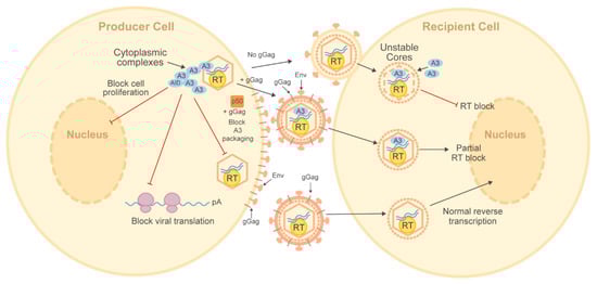 The prevailing mechanism for reduced HIV-1 infectivity mediated by A3 enzymes has been shown in cell culture studies [,,] as well as experiments in HIV-infected humanized mice [,] (Figure 2). In the absence of Vif, cytosolic A3 proteins bind HIV-1 genomic RNA, cellular RNA, and HIV-1 nucleocapsid (NC) protein for assembly into virions [,,,,,]. NC binding is an essential step for A3 virion packaging. For efficient packaging, the interaction between NC and APOBEC is highly dependent on APOBEC association with diverse RNAs, including viral RNA and cellular RNA [,,,]. Multiple studies have demonstrated that 7SL1 non-coding RNA (ncRNA) may play a more significant role than the HIV-1 genomic RNA in A3 assembly into virions [,,,,]. A unique feature of A3G is its binding to the Alu region of 7SL1 RNA for virion packaging [,,,]. A comparative study using cross-linking immunoprecipitation coupled to next-generation sequencing has shown that A3 proteins bind HIV-1 genomic RNA preferentially over cellular RNA in infected cells []. In immature and mature virions, A3 proteins bind G- and A-rich RNA sequences, mimicking properties of the NC domain of the HIV-1 Gag protein, which is a major constituent of immature particles [,]. These data suggest a model in which A3 incorporation into HIV-1 virions is facilitated by preferential binding to G- and A-rich RNA [,]. Each virion contains approximately 7 (±4) A3G proteins that are associated with HIV genomic RNA in the virion core [,]. However, 1–2 A3G per virion may be sufficient for HIV-1 hypermutation and restriction [].