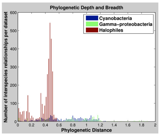 Comparative phylogenetic depth and breadth of datasets used in OLS comparison analyses. Phylogenetic distances were determined between all organisms used in two previous cross-species OLS comparisons analyses as well as the organisms we used in this study (see Methods). The organisms used in our investigation (“halophiles”, red) offer less breadth than those used in previous studies (“cyanobacteria”, blue, and “gamma-proteobacteria”, green), however, provide significantly more depth. This additional depth allows us to observe many more types of OLS modification, and increases the confidence with which report our results.
