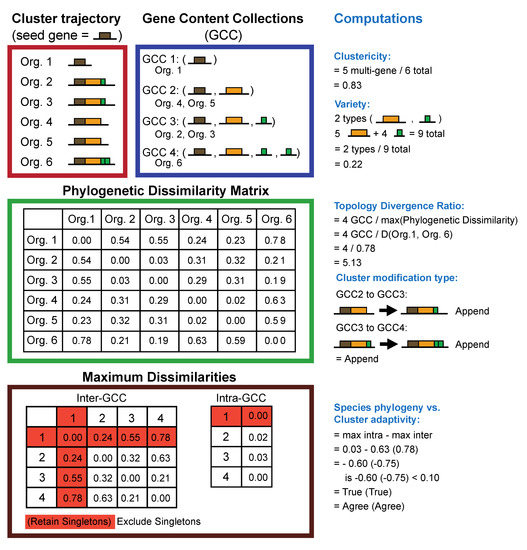 Visualization of Context Trajectory Computations. Computations applied to context trajectories are exemplified in a theoretical context trajectory: OLSs are found in six organisms described as Orgs 1–6, and contain between one and four genes (red box). This trajectory contains four gene content collections (blue box), and clustericity and variety scores of 0.83 and 0.22 (top right), respectively. Based on a theoretical matrix of species-level phylogenetic dissimilarities (green box), this trajectory has a topology divergence ratio of 5.13 (middle right). Evaluation of the gene content collections in this trajectory indicate that this context trajectory exhibits an OLS modification type of “Append” (middle right). A comparison of the dissimilarities between organisms found both within and outside of the gene content collections (brown box) enables a comparison of species phylogeny and OLS adaptivity (bottom right), which is evaluated both retaining and excluding singleton genes (red highlighter, brown box). In this example, the species-level phylogeny is consistent with differences in OLS topology between species whether or not singleton genes are excluded.