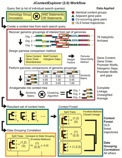 We previously developed JContextExplorer [36] to quantitatively compare the local genomic topology of gene groupings across the genomes of multiple species using a variable-group agglomerative hierarchical clustering algorithm. In this paper we report the implementation of several new features that we have used to investigate changes in OLS across the haloarchaeal genomes. These new features allow the user to create custom metrics to define biologically interesting groups of genes, compare topological features (i.e., gene content, gap sizes, etc.) of these groups to each other, associate promoter and protein-binding site information with individual genes, associate and compare context trees to imported phylogenetic trees, correlate a set of context trees to external data, and finally, draw variable-group agglomerative hierarchically clustered trees where the leaves are context trees themselves—creating what we term a “context forest”. The updated JContextExplorer workflow (Figure 3) is well suited for quantitatively investigating cross-species changes in homologous gene groupings (not limited to OLSs).