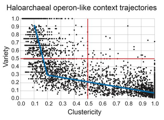High clustericity and high variety is rare among OLS trajectories. A comparison of the haloarchaeal OLS trajectories revealed a large distribution of behavior with respect to clustericity and variety. In the above plot, each data point is a single context trajectory. Red lines segregate into 4 quadrants based on high or low clustericity paired with high or low variety. Note that the quadrant (high clustericity and high variety) is sparsely populated compared to the other three quadrants. This suggests that when many OLS gene content modifications occur (high variety), a large number of singleton gene states are also observed (decreased clustericity). A blue line is drawn to indicate a two-part piecewise fit. We propose that this model may be used to explain the path of a singleton gene evolving into a large, conserved OLS: initially, there is an exploratory phase (left blue line), where rapid formation of OLSs and dissolution of OLSs may occur until a stable OLS is formed, after which a long phase of tuning and refinement may follow (right blue line).