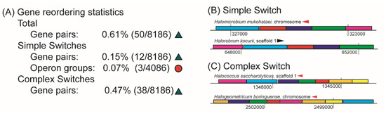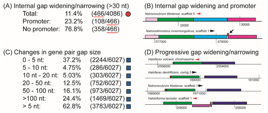 Aside for changes in gene content, OLS topology may vary in other ways: these include changes in gene order, the gain and loss of promoter sites, and changes in intergenic gap size [29,30,31,32]. We assessed the haloarchaeal OLSs for a variety of topological changes, quantitatively evaluated the degree at which these changes were observed, and identified several interesting examples of OLSs exhibiting these changes.