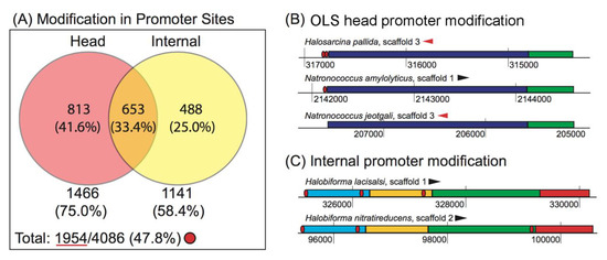 Promoter modification is a highly prevalent OLS modification strategy in the haloarchaea: Nearly half (1954/4086, or 47.8%) of the OLSs in each identical gene content group demonstrated one or more changes in their promoter content. We further subclassified these OLSs according to promoter modification events occurring at the head of an OLS and promoter modifications at internal gene start sites, as these two types of events signify biologically distinct phenomena: the appearance or disappearance of a promoter at an OLS head is representative of gain or loss of a promoter, which may affect the strength of expression [42] and noisiness [43] of the entire OLS, while the appearance or disappearance of internal promoters is related to differential expression of a subset of genes in the OLS under a particular set of conditions [25]. Significant attention has been paid in the literature to programs of sub-OLS gene expression [24,25,44]. However, less has been paid to whole OLS tuning, especially how this may change across species. We found that among the haloarchaea, cross-species OLS evolution more often occurred in altering the machinery associated with tuning whole OLS units by modifications at their head (1466/1954, or 75.0%) than in condition-dependent gene subsets of the OLS by modifications at internal sites (1141/1954, or 58.4%) (Figure 6A).