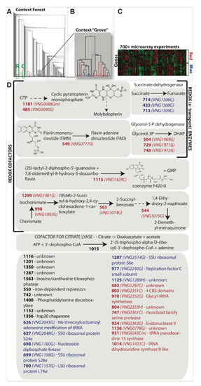 We can expect that conservation of function in multisubunit complexes where all components are required for function could drive grove formation in the context forest. We see this to be the case for most of the ABC family transporters and genes in known ribosomal operons (Figure 8A, Figure S11). We can also expect that operons encoding key enzymes in metabolic pathways required for coordinated functions might cluster together in groves and see evidence for this with known cobalamin gene operons, for example (Figure 8A, Figure S11). We can also hypothesize that coordinated regulatory relationships might drive genes into context groves. We see evidence for this as well. The specific example shown in Figure 8 shows suggestive evidence for the conservation of context for putative functional reasons that may be related to the regulatory coordination of distantly spaced genes. The grove described in Figure 8B illustrates a functional theme associated with respiration, particularly anaerobic metabolism, Figure 8D. The grove includes two dehydrogenates (succinate and glycerol-3-phosphate) and genes encoding enzymes in the biosynthesis of key co-factors involved with the dehydrogenases (FAD and menaquinone) and other redox cofactors molydbopterin, coenzyme F420, and a rather unique co-factor for the enzyme citrate lyase. While not perfect, genes in the grove seem to separate relatively well by expression cluster along the two main branches of the context grove (Figure 8B,C). Finally, we note that this grove contains genes from OLS that are spread across the chromosome in H. salinarum NRC-1 and in all other organisms investigated. Membership in this grove is therefore not an artifact of local synteny.