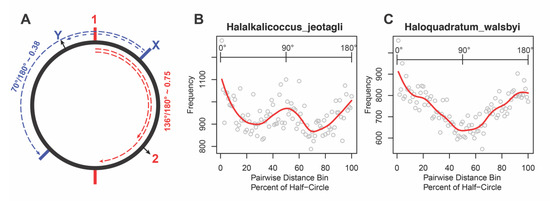 The recent work of Takemata et al. [56] provides evidence of distinct 3D structural domains in the chromosome in at least two Sulfolobus species that appear to functionally compartmentalize regions of the chromosome. Takemata et al.’s model suggests that the spatial organization of genes along the chromosome is likely subject to selective pressure and that this can organize functionally related genes (or clusters of genes) at distances along the chromosomal coordinate that are much longer than the distances characterizing OLS. If a similar organizational mechanism is used in the haloarchaea, depending on the complexity of the organization, we would expect to see some preferential spatial organization among the highly conserved genes in the chromosomes of the haloarchaeal genomes. To examine this phenomenon, we explored the context forest to determine whether we could see any evidence of long-range structural organization of the putatively-orthologous genes. For 11 organisms in our dataset whose genome sequences were completely closed when we started our study (Halalkalicoccus jeotagli, Haloarcula marismortui, Halobacterium salinarum NRC-1, Haloferax volcanii, Halogeometricum borniquense, Halomicrobium mukohataei, Haloquadratum walsbyi, Halorhabdus utahensis, Haloterrigena turkmenica, Natrialba magadii, and Natronomonas pharaonis) we examined the pairwise genomic position about a relative chromosomal bisect for pairs of genes that are present in the context forest and that also co-occur on the main chromosome of each organism (Figure 9A). While few obvious spatial patterns emerged in the analysis of 9 of the 11 chromosomes (Figure S12), we did observe bias in the pattern of pairwise distances in the genomes of Halalkalicoccus jeotagli and Haloquadratum walsbyi. Figure 9B,C show the frequency of pairwise distances relative to half the distance around the circular chromosome for Halalkalicoccus jeotagli and Haloquadratum walsbyi, respectively. In Halalkalicoccus jeotagli we observe clustering at short distances (likely local structure conservation like that found in OLSs), a peak of conserved distances approximately half the distance about the half circle (~90° apart), and another tendency to organize the pairwise distances of these genes across from one another in the chromosome (~180° apart). In the chromosome of Haloquadratum walsbyi, we observe a similar clustering of genes at small distances and a second peak at 180°. While neither of these observations indicates that these genomes are functionally compartmentalized like those of the two Sulfolobus species described by Takemata et al. [56], these patterns are nevertheless consistent with this behavior.