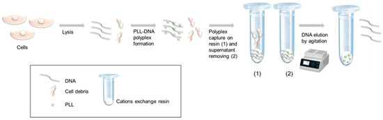 Principe of DNA extraction and purification while using DNA-polylysine (PLL) resin complex. (1) polyplex was captured on resin (2) supernatant was removed.