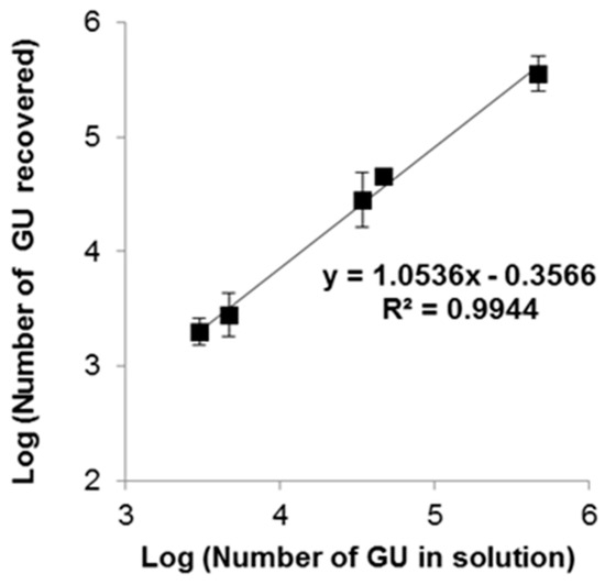 Assessment of the method’s linearity. Curves represent the log of the expected number of GU in the solution as a function of the number of GU recovered after extraction. Error bars represent the standard deviation for n = 3.