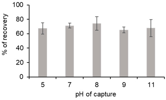 Influence of the pH on DNA capture. Five pH capture samples were tested. The percentage recovery corresponded to the percentage of DNA recovered after the process ended. Error bars represent the standard deviation for n = 3.