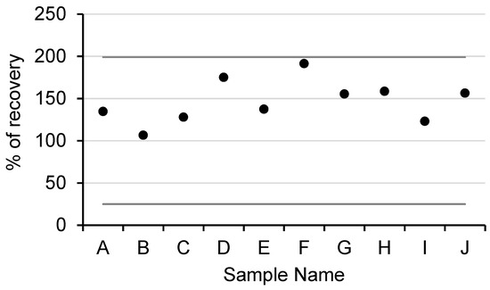 The percentage recovery ranged from 66% to 98%. Data showed strong linearity, with a slope and Y intercept of 1.05 and −0.35, respectively, with a good correlation coefficient (R2 = 0.99) (Figure 3).