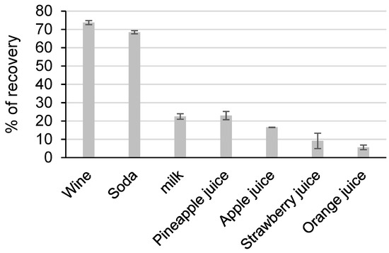 Good extraction yields were obtained for wine and soda, but low percentage recovery values were found for other matrices, i.e., milk and juices.