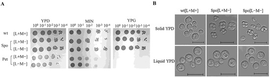 The generated strains were named after the phenotype and dsRNA content. Pet cells, namely Pet [L+M−] and Pet [L−M−], exhibit petite phenotype, determined by small size colonies on YPD plates, incapability to grow on medium supplemented solely with glycerol as a carbon source (Figure 1A). Spo cells, namely Spo [L+M−] and Spo [L−M−], grew on YPG medium and generated colonies of similar size as the wild type (wt) cells (Figure 1A). Spo cells sporulated on a solid growth medium contrary to the wt [L+M+] strain (Figure 1B). Sporulation frequency on a solid YPD medium was 27.7 ± 1.2% for Spo [L+M−] cells and 42.9 ± 1.6% for Spo [L−M−] cells, with no sporulation observed in a liquid YPD medium. We have not detected sporulating wt, Pet [L+M−] and [L−M−] cells neither on solid or liquid YPD medium. Unfortunately, we were unable to detect S. paradoxus AML-15-66 [L+M−] and [L−M−] cells with no additional phenotype changes, besides the abolishment of the killer trait.
