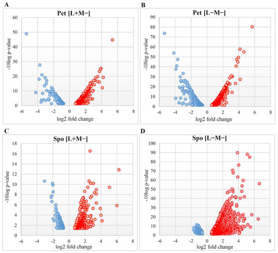 Volcano plots depicting gene expression alterations in S. paradoxus AML-15-66 [L+M−] and [L−M−] cells. Scattered points represent altered transcription genes: red-up-regulated, blue-down-regulated. The x-axis is the fold change for the differentially expressed genes with respect to the wild type cells, whereas the y-axis is the statistic or Log Odds, representing the probability that a gene has statistical significance in its differential expression. Differentially expressed genes in (A) Pet [L+M−], (B) Pet [L−M−], (C) Spo [L+M−], and (D) Spo [L−M−] are depicted.