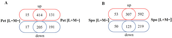 Venn diagrams representing numbers of differentially expressed genes in S. paradoxus AML-15-66 [L+M−] and [L−M−] cells. Numbers of up-regulated genes are in red, down-regulated-blue. Numbers of up- and down-regulated genes in (A) Pet [L−M−] (left) and Pet [L+M−] (right); (B) Spo [L−M−] (left), and Spo [L+M−] (right) cells are represented.