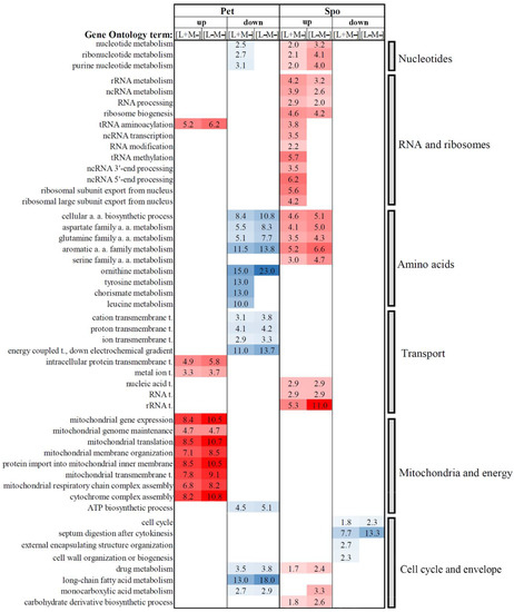 DEGs in Pet and Spo cells were related to numerous biological processes, including metabolism and biogenesis of nucleotides, RNA, ribosomes, amino acids, carbohydrates, and lipids (Figure 4, Tables S3 and S4). Genes of altered transcription were also linked to cellular transport, mitochondria, cell cycle, and cell envelope (Figure 4, Tables S3 and S4). GO analysis confirmed that biological processes related to mitochondria prevail in Pet cells, while those linked to RNA and ribosomes dominate in Spo cells. Transcription of genes related to mitochondria and ATP biosynthesis appeared dysregulated in Pet cells, probably because of the inactivation of aerobic respiration in these cells, and acts to compensate for this loss. Metabolic processes of amino acids were oppositely regulated in Pet and Spo cells, probably because of the differences in energy generation.