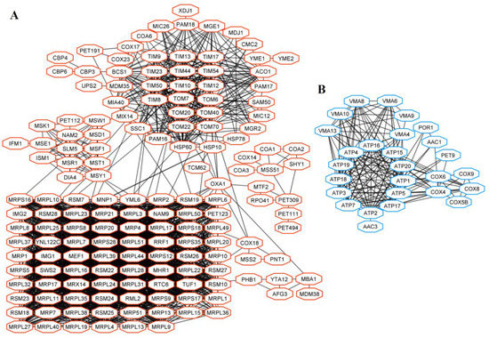Proteins important for mitochondrial membrane organization (Mgr2, Mic12, Sam50, and others) and mitochondrial transmembrane transport (Tim- and Tom- proteins, Oxa1, Ssc1, and Pam16) were also encoded by positively regulated genes in Pet cells (Figure 5A). Down-regulated genes of Pet [L+M−] and [L−M−] cells are mostly related to ATP biosynthetic process (ATP synthase and cytochrome c oxidase genes), vacuolar membrane ATPase genes (VMA6, -8, -9), and encoding transporters (Aac1, Aac3, and others) (Figure 5B). The products of up- and down-regulated genes in Pet cells are interconnected at a high confidence level.
