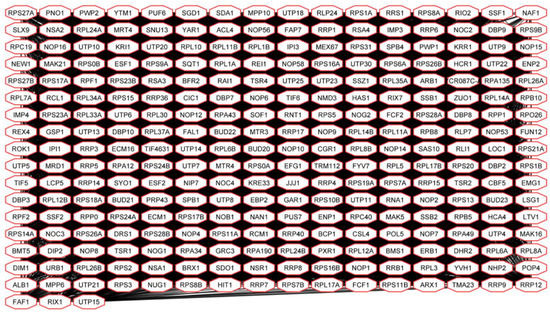Interconnection of gene products of up-regulated genes in Spo [L+M−] and Spo [L−M−] cells involved in ribosome biogenesis.
