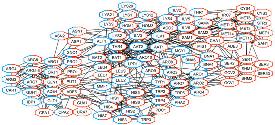 Network of gene products related to the biosynthesis of amino acids encoded by DEGs in Pet and Spo cells. Products of up-regulated genes in Spo cells-red; down-regulated in Pet cells-blue.