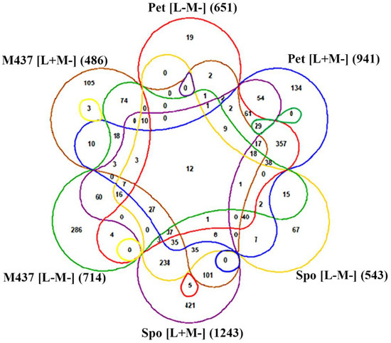 Six-way Venn diagram representing the distribution of DEGs between S. paradoxus AML-15-66 Spo [L+M−], Spo [L−M−], Pet [L+M−], Pet [L−M−] and S. cerevisiae M437 [L+M−] and M437 [L−M−] cells. Up- and down-regulated genes were not analyzed separately. Numbers represent the quantity of shared DEGs between the datasets. Data from [12] were used for the analysis of DEGs in M437 cells.