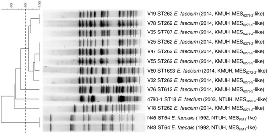 PFGE analysis of the 13 MES-carrying enterococcal strains. The dendrogram was produced by BioNumerics software, showing distance calculated by the Dice similarity index of SmaI-digested DNA fragments. The degree of similarity is shown in the scale. The strain number, ST, species, isolation year, isolation hospital, and MES types are indicated in the figure.