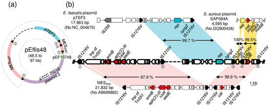 E. faecalis N48 was chosen for DNA sequencing to determine the MES-like structure and the surrounding genetic environment. An incomplete plasmid sequence of 50,564 bp in length was determined, and sequence analysis revealed that the MESPM1-like structure was located on a mosaic plasmid, pEflis48 (Figure 3a). Positions 1–9944 nt showed 99.7% DNA sequence identity to the corresponding region of the E. faecalis plasmid pTEF3. Positions 9136–14,615 and 34,166–50,564 showed 98.4% DNA sequence identity to MESPM1 in ST59 MRSA. Positions 14,616–16,723 and 16,724–34,144 showed 99.3% and 99.0% DNA sequence identity to the corresponding regions of the E. faecalis plasmid pEF10748 and E. faecalis ATCC 29,212 plasmid 2, respectively.