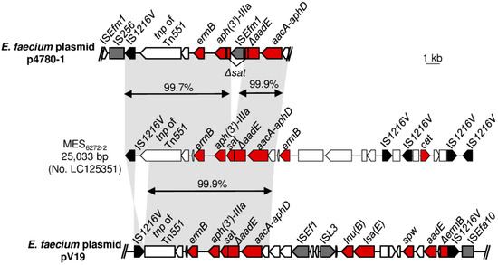 Genetic organization of MES6272-2-like structures in p4780-1 and pV19. The arrow indicates an open reading frame. The rectangle indicates a truncated gene. Black, grey, and red colors indicate tnp (transposase) of IS1216V, tnp of other insertion sequences, and resistance determinates, respectively. Homologous regions are shaded.