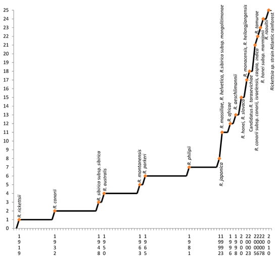 The number of pathogenic species of bacteria belonging to the genus Rickettsia known in particular years. The first publication with description of the species was considered as the date.