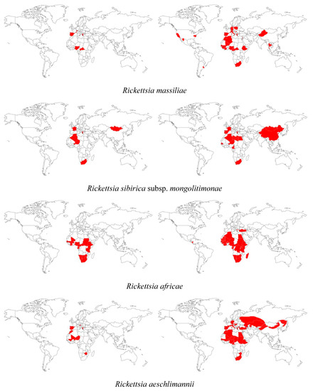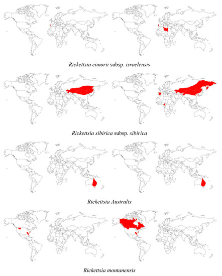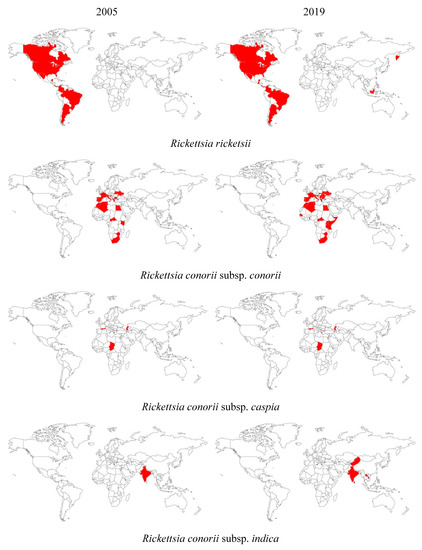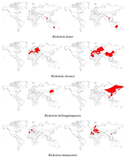 The occurrence of pathogenic tick-borne species belonging to the genus Rickettsia in the world at the beginning of the 21st century compared to now. On the left—the state of knowledge in 2005. On the right—the state of knowledge in 2019 [1,4,17,18,19,20,21,22,23,24,25,26,27,28,29,30,31,33,35,36,38,39,41,42,43,44,45,46,47,56,98,99,100,101,102,103,104,105,106,107,108,109,110,111,112,113,114,115,116,117,118,119,120,121,122].