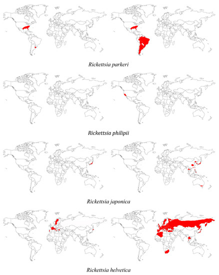 New cases of rickettsioses and new locations where the presence of bacteria of the genus Rickettsia are recognized are still being identified. The variety and rapid evolution of the distribution and density of ticks and diseases which they transmit shows us the scale of the problem. It is presented below what the distribution of pathogenic species of the genus Rickettsia looks like in the world in comparison to the beginning of our century (Figure 2).