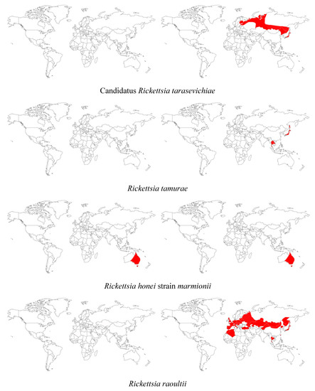 - Satjanadumrong, J.; Robinson, M.T.; Hughes, T.; Blacksell, S.D. Distribution and ecological drivers of spotted fever group rickettsia in Asia. Ecohealth 2019, 16, 611–626. [Google Scholar] [CrossRef]