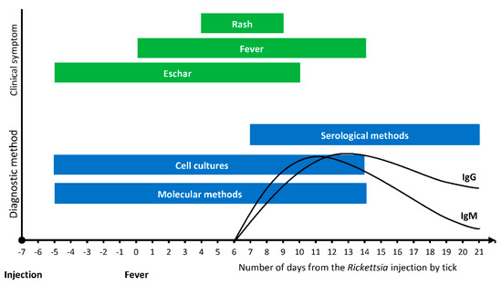 Each method of diagnosin rickettsial infections has its advantages and disadvantages. Cultures and molecular methods can be used for diagnosis in the early stage of acute infection. Serology can only be used as a diagnostic method when IgM and IgG become detectable, which occurs only about 10 days after inoculation. Antibodies become detectable at the same time, however, higher levels of IgM have been reported in the earlier stage, while IgG levels remain high for a longer time. Many researchers conclude that the combination of serological and molecular methods is the most effective way to diagnose the infection and to determine which Rickettsia species is present in a patient (Figure 3) [124].