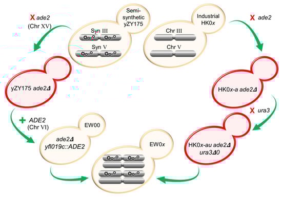 - Shen, M.J.; Wu, Y.; Yang, K.; Li, Y.; Xu, H.; Zhang, H.; Li, B.; Li, X.; Xiao, W.; Zhou, X.; et al. Heterozygous diploid and interspecies SCRaMbLEing. Nat. Commun. 2018, 9, 1934. [Google Scholar] [CrossRef]