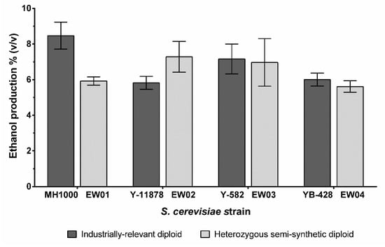 Ethanol production of S. cerevisiae industrially relevant diploids (MH1000, Y-11878, Y-582 and YB-428) and semi-synthetic heterozygous diploids (EW01-EW04). Ethanol concentration was measured after cultivation in YPD with high glucose concentration (20 g L–l glucose) at 30 °C for 120 h. There was no difference in ethanol production from semi-synthetic strains compared to the corresponding industrial diploids, except for the EW01 strain, compared to the parental MH1000 strain.