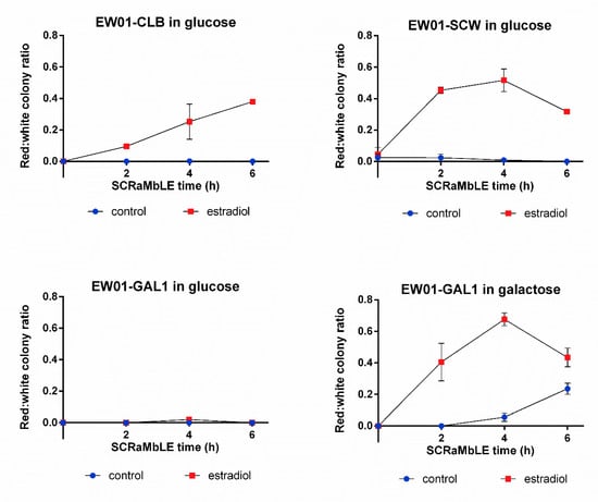 With the exception of the glucose-grown EW01-GAL strain, the rapid generation of red colonies was observed after 2 h of estradiol addition (Figure 5), with more than 65% of the post-SCRaMbLE population being red in the EW01-GAL (grown in galactose) strain after 4 h of estradiol exposure (Figure 5). There was a gradual increase in red colony frequencies for all strains up to the 4 h time point, after which the EW01-SCW and EW01-GAL (grown in galactose) strains had reductions in the ratio of red colonies at 6 h after estradiol addition.