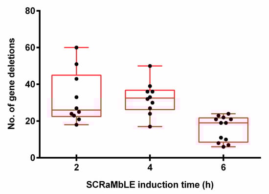 With the exclusion of two outlier strains, which had lost the majority of synthetic chromosome VI, a significant variation in gene-loss frequencies was observed between the white colonies evaluated at each time point, with 7–60 gene deletions per strain (Figure 6). On average, strains had 26 deletions after 2 h of induction, which increased to 33 at 4 h of estradiol introduction. In accordance with the RED assay, the average number of gene deletions decreased to 19 per strain for the 6 h time point. A genomic heat map (Figure A3), showing the frequency of gene loss across synthetic chromosomes III and VI, revealed a non-random distribution of gene deletion events over the length of both synthetic chromosomes.