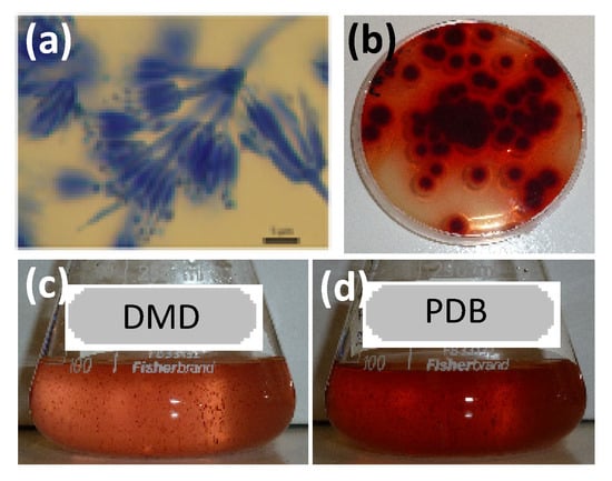 Morphological features of the marine-derived Talaromyces sp. 30570 strain: (a) Conidiophores produced on Potato Dextrose Agar (PDA) media, stained with lactophenol blue (scale bar 5 μm); (b) Reverse face of fungus grown on PDA; (c) Red pigment production in Defined Minimal Dextrose (DMD) medium incubated for 7 days at 24 °C; (d) Red pigment production in Potato Dextrose Broth (PDB) medium incubated for 7 days at 24 °C.