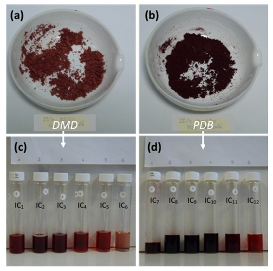 Red-colored dried residues obtained from submerged culture of the marine-derived Talaromyces sp. 30570 strain (a) in DMD, or (b) in PDB medium; (c,d) intracellular (IC) liquid extracts obtained using the pressurized liquid extraction method on mycelial cells of Talaromyces sp. 30570. The sequence of solvents was set to display a decreasing polarity profile (from IC1 to IC6; or from IC7 to IC12): purified water was used as the first extraction solvent, followed by 50% aqueous methanol, then 50% aqueous ethanol, >99.9% methanol, and MeOH:EtOH (1/1, v/v), and >99.9% ethanol as the last extraction solvent.