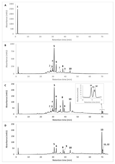 LC-DAD chromatograms of the fungal extracts from the mycelium of the marine-derived Talaromyces sp. 30570 strain cultivated in Potato Dextrose Broth (PDB). Pigments were extracted by pressurized liquid extraction: (A) water, (B) 50% aqueous methanol, (C) 50% aqueous ethanol, or (D) by pure methanol as extraction solvent. Assignment of the azaphilone red pigments 1–12 and ergosterol 13 were done by UV-visible and HRMS spectra. See Table 1 for the identification of the molecules.