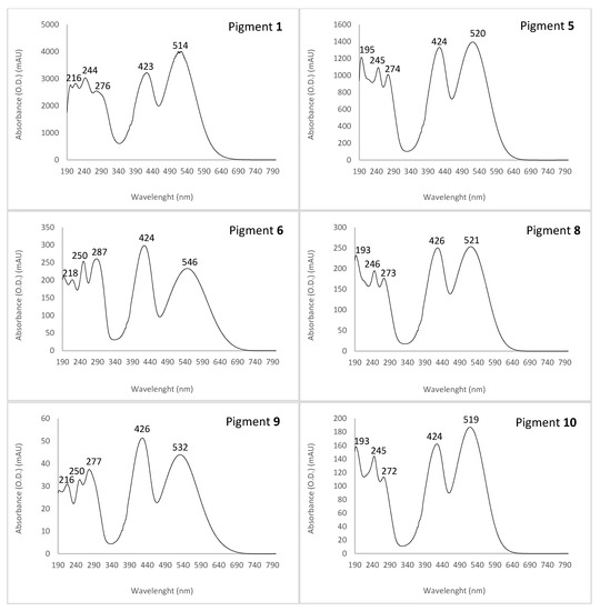 The UV-visible absorption spectra of the major pigmented molecules (compounds 1, 5, 6, 8, 9 and 10 detected by HPLC-DAD, Figure 3) produced by the marine-derived Talaromyces sp. 30570 fungal strain are shown in Figure 4.