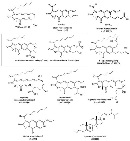 Main Monascus-like nitrogen-containing azaphilone pigments produced by the marine-derived Talaromyces sp. 30570 fungal strain. Assignment of the pigments (2–10) and ergosterol (13) were done by UV-visible spectra and HR-ESI-MS according to their mass to charge ratio. It is presumed that the major red pigment 5 produced by the fungal strain (see sidebar) might reasonably be the molecule N-threonyl-rubropunctamin (C25H29NO7, m/z 455) or the acid form (R-COOH) of the pigment PP-R (C25H29NO7, m/z 455) as recently reported by Rasmussen [30].