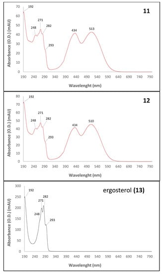 UV-visible spectra of the ergosterol (colorless compound 13) and the two pigmented ergosterol derivatives of azaphilone compounds 11 and 12 with reference to the chromatograms shown in Figure 3, detected in the present study in intracellular extracts of the marine isolate Talaromyces sp. 30570.